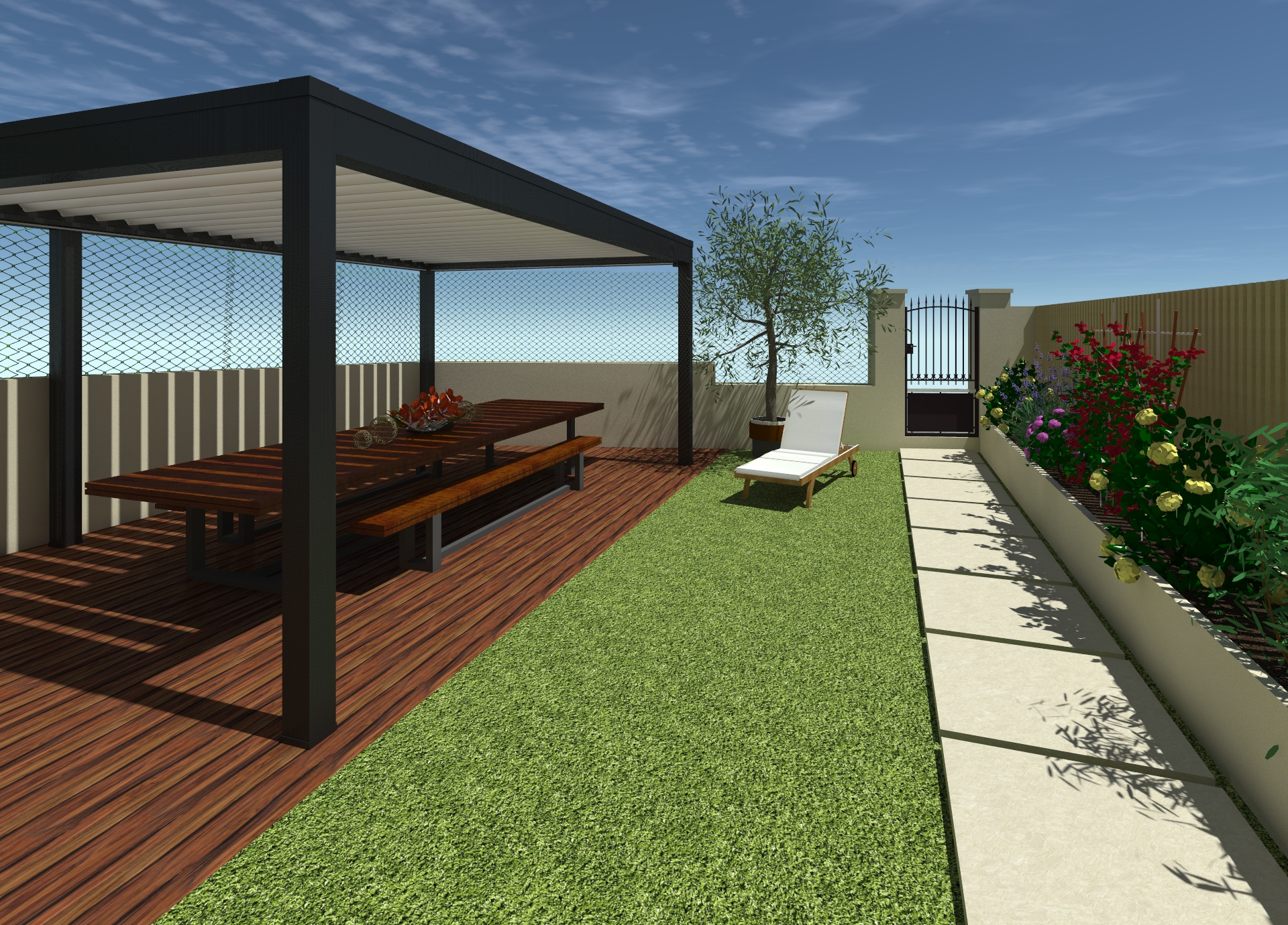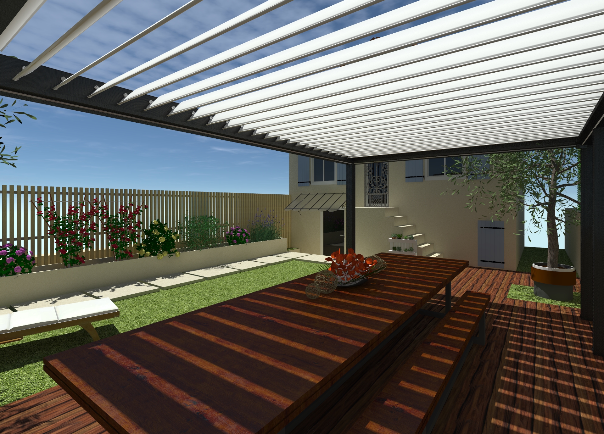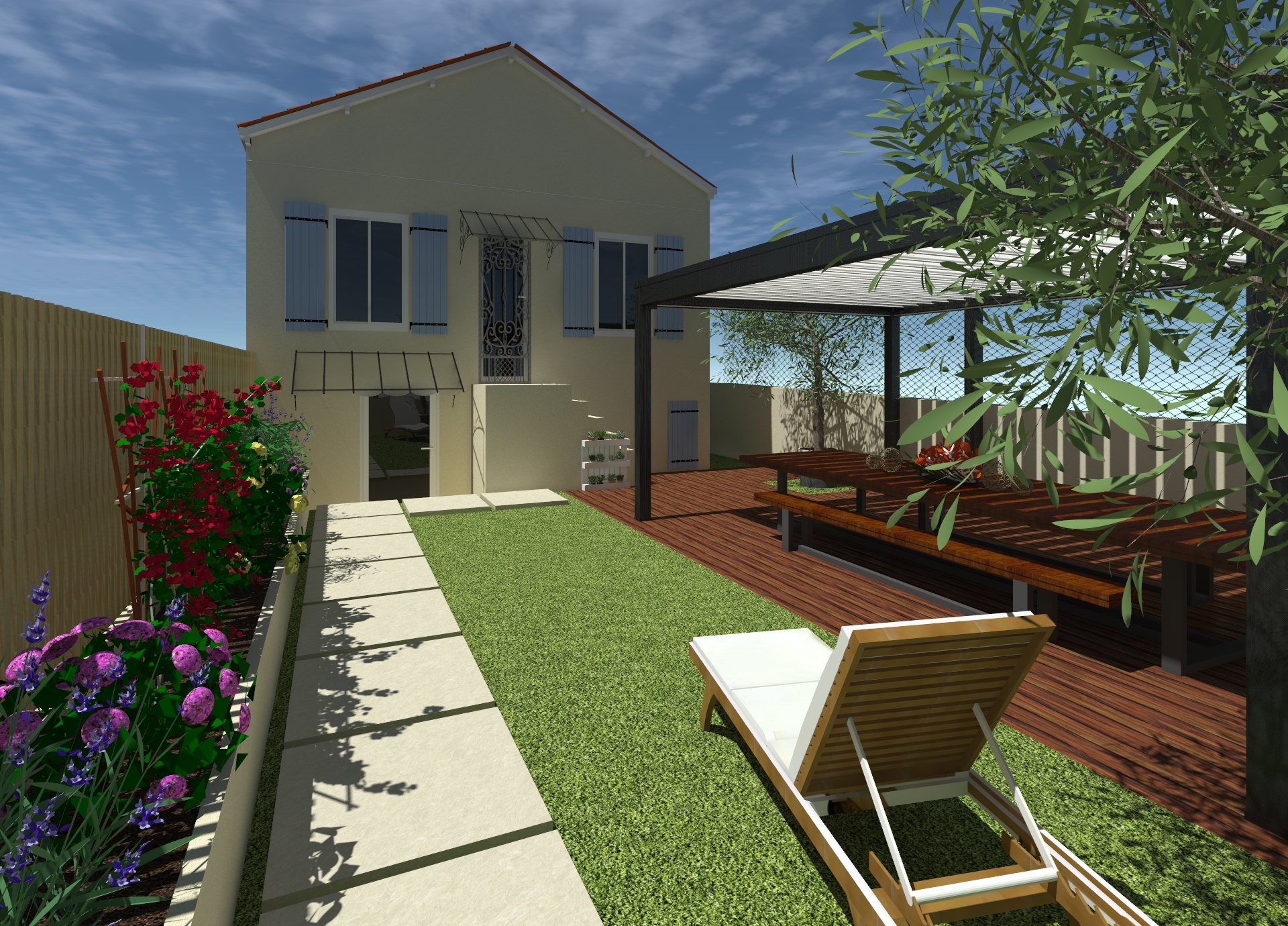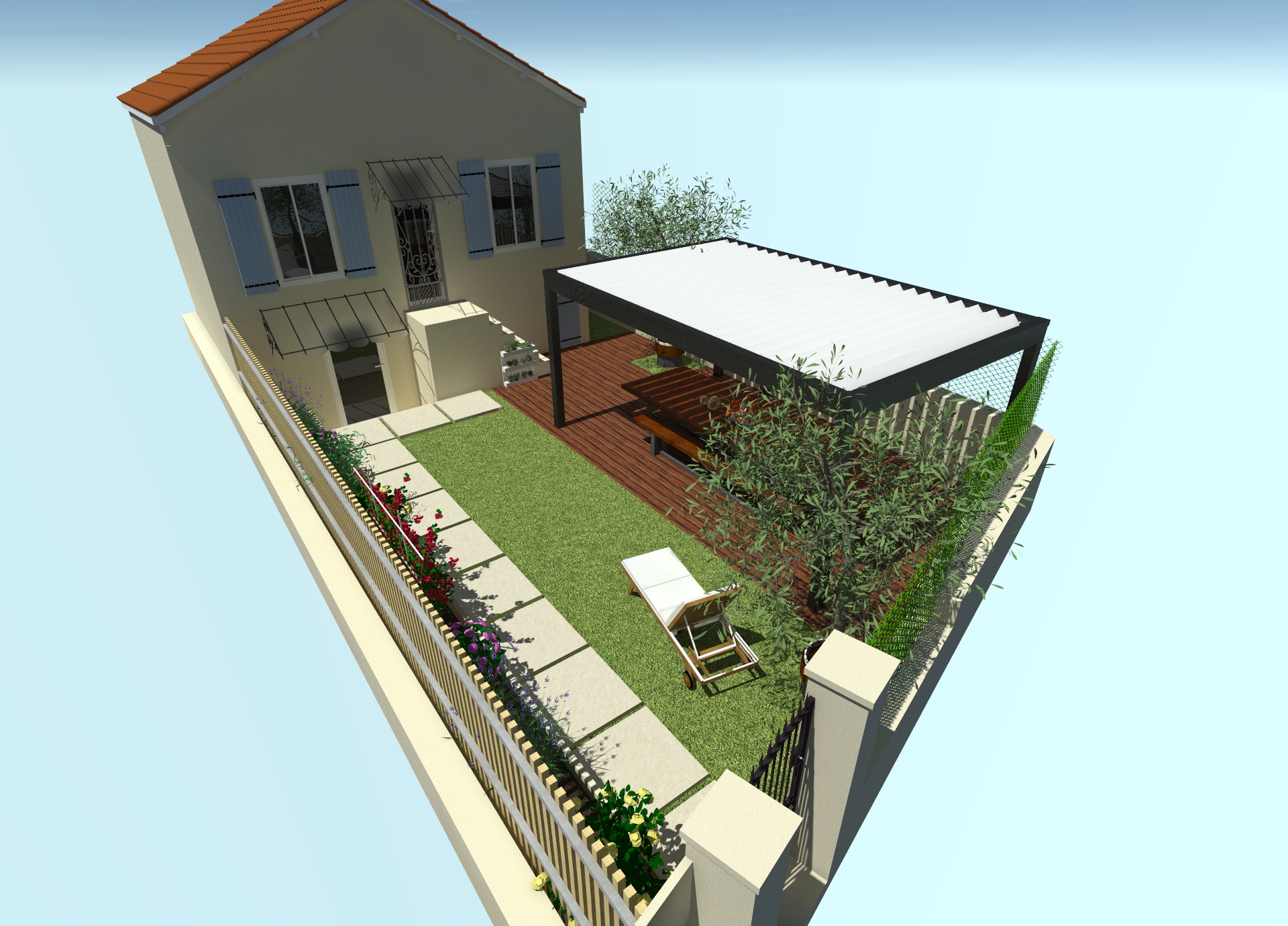 Ma cliente m’a confié l’aménagement de son jardin, en souhaitant créer un espace de réception spacieux pour les repas en famille et entre amis, avec un coin ombragé. Elle apprécie les plantes mais ne voulait pas qu’elles soient trop présentes. J’ai donc conçu une jardinière linéaire le long du mur périphérique pour ajouter une touche de verdure sans encombrer l’espace. J’ai également travaillé sur différents traitements de sol pour délimiter les zones et instaurer un rythme visuel agréable dans le jardin.